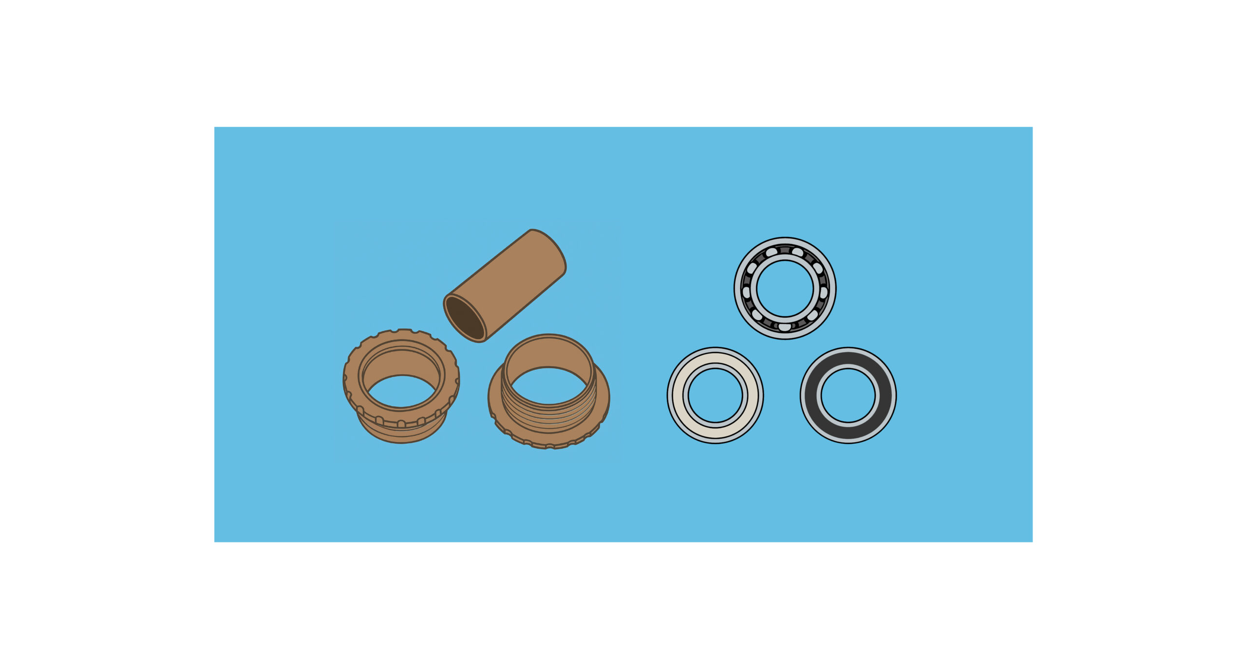ボトムブラケットは、主に「ワン」や「ユニット」と呼ばれるフレームにはめ込まれる部分と、その内部に収まる「ベアリング」で構成されています。ベアリングがクランク軸(スピンドル)を支え、スムースな回転を可能にしています。